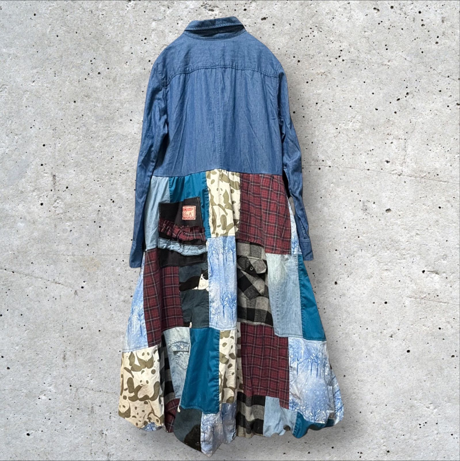 ファッション 新品リメイク ワンピース ロングスカート パッチワーク 再構築 新品ファッション リメイクドレス 新品リメイクワンピース スカート バルーンスカート 猫 ネコ柄 黒猫 はちわれ ハチワレ猫 パンダ デニムリメイク デニムシャツ