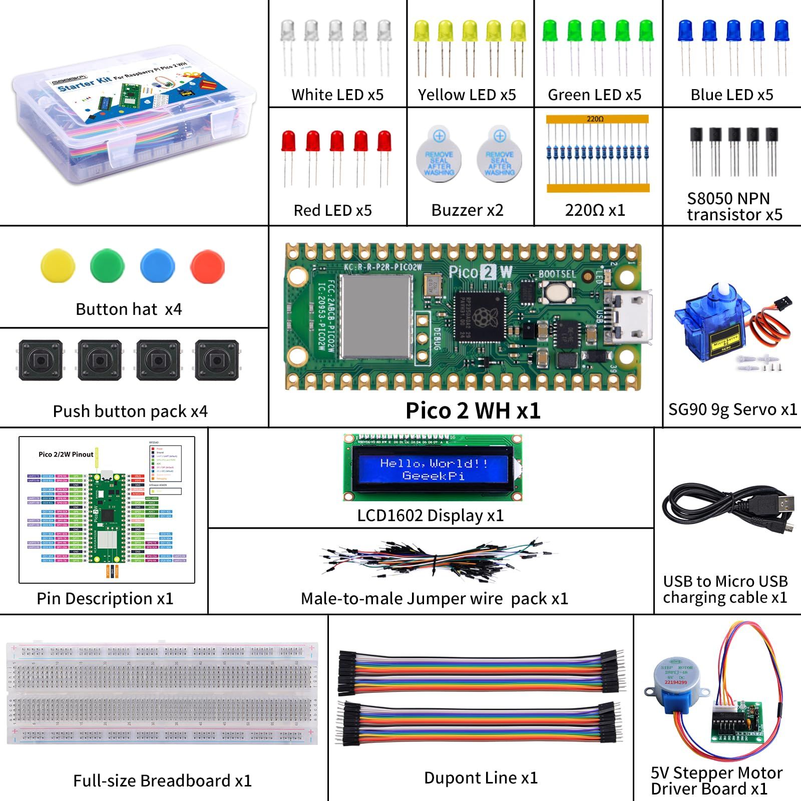 完全なセット: Raspberry Pi Pico 2 WHには、ピンヘッダー、LCDディスプレイ、800穴ブレッドボード、そしてすぐにプロジェクトを開始できる豊富なアクセサリが付属しています
