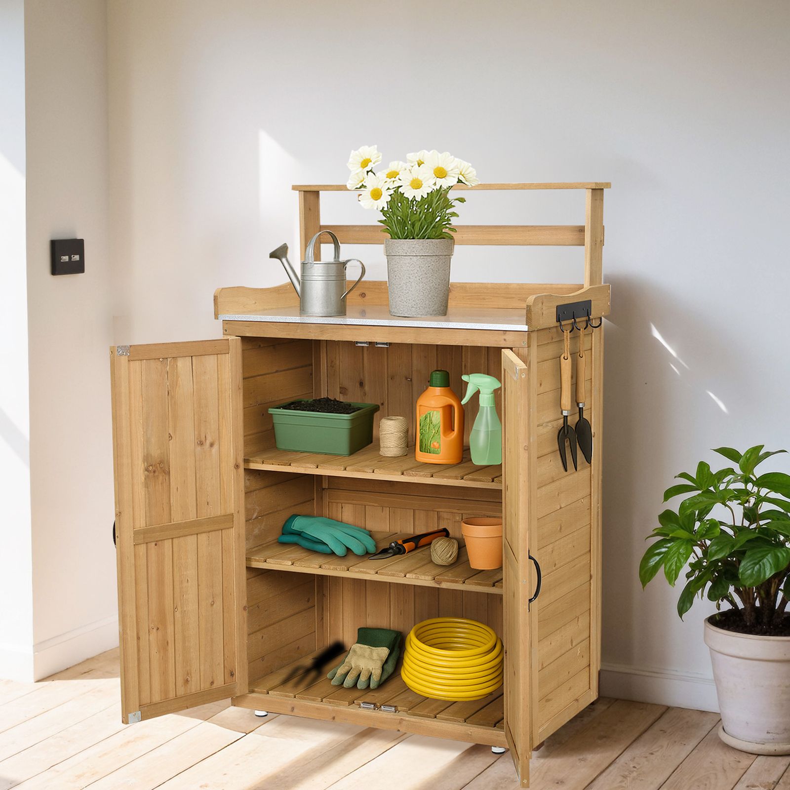 物置き 木製 収納庫 観音扉 ガーデニング用品 小屋 戸外収納庫 大型 屋外物置 棚 ドア ベランダ 屋外収納 ガーデニング ウッド 園芸用品 庭 倉庫 DIY 頑丈 ナチュラル