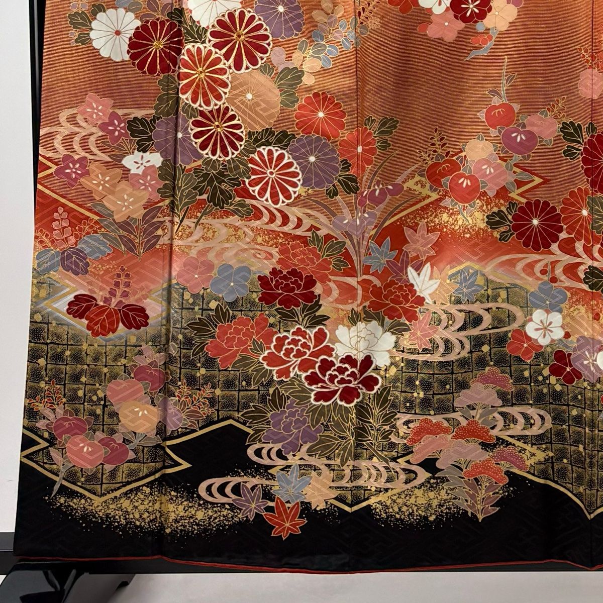 振袖 身丈160 cm 裄丈63 S 袷 菊 流水 金糸 金彩 茜色 正絹 秀品