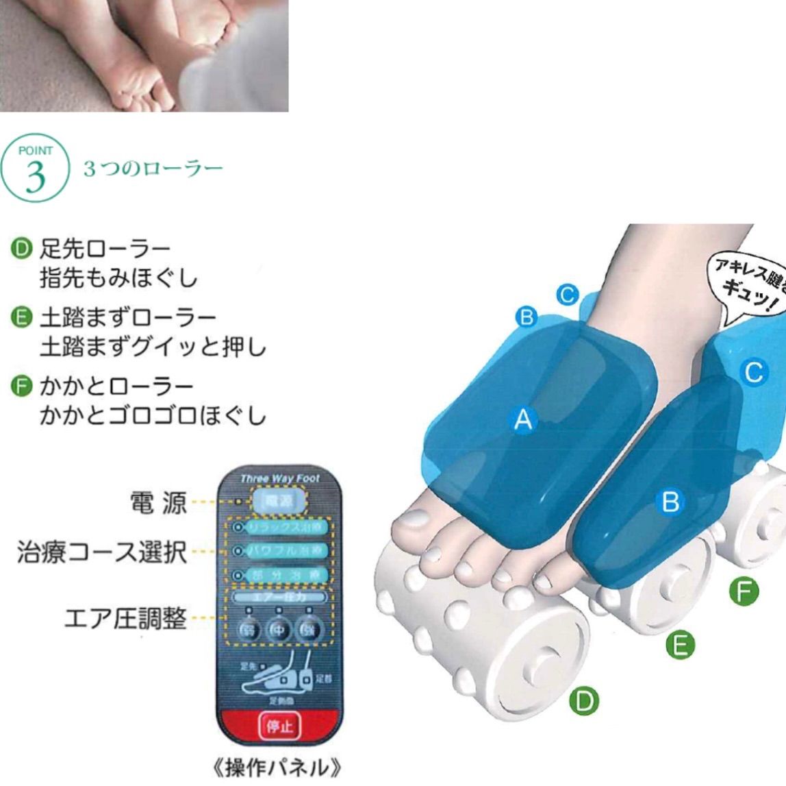 ●3つのローラー治療+ストレッチ! 足先ローラー、土踏まずローラー、カカトローラー等3軸6つのローラーによる治療をバランスよく融合。